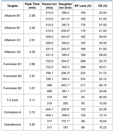 Note: The detection of zearalenone is in negative ion mode(ESI-), and the others are in positive ion mode (ESI+).