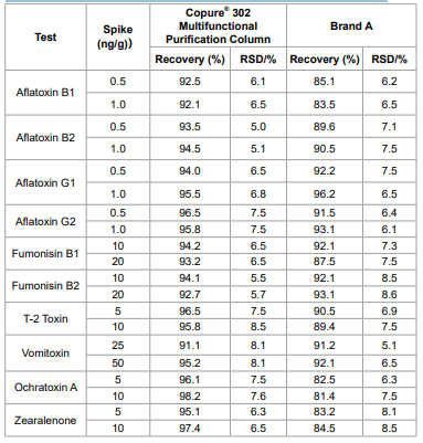 Based on Table 2, the recovery rates of 10 Mycotoxins areall between 90-110% with RSD less than 10%, which meetthe standard of the experimental requirements. The overallevaluation of recovery rate is better than Brand A.