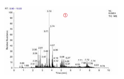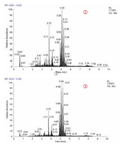 Based on Figure 1, the interference of impurities in sample ③ is obviously reduced, therefore miscellaneous peaks are fewer inthe TIC chromatogram. The purification effect of Copure® 302 Multifunctional Purification Column is better than Brand A to meetexperiment requirements.