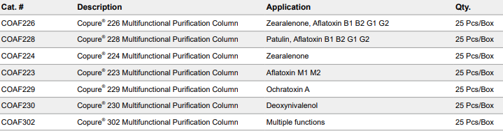 Mycotoxins are toxic secondary metabolites produced byfungi, primarily absorbed by humans through diet. Aspergillus,Penicillium, and Fusarium are the main genera generating themost common mycotoxins found in food, including aflatoxin,ochratoxin A, sterigmatocystin, patulin, fumonisin, zearalenone,deoxynivalenol, NIV, T-2 toxin, etc. Biocomma establishedan LC-MS/MS method using Copure® 302 MultifunctionalPurification Column for detection of 10 mycotoxins in wheatflour with good recovery and stability for your reference.