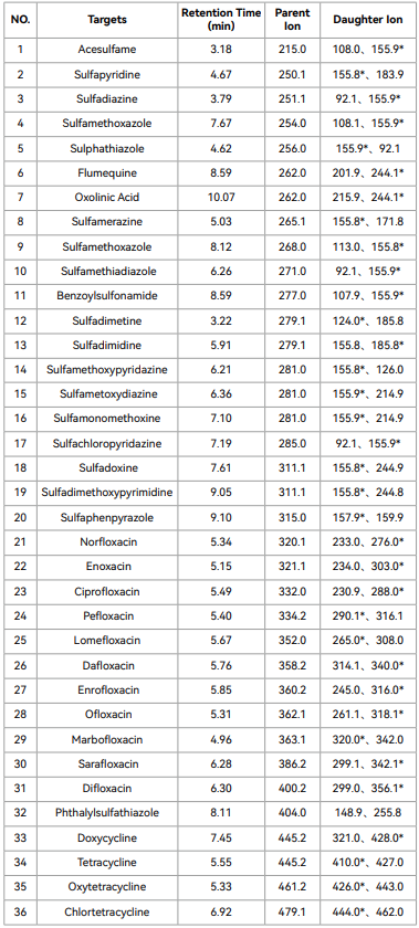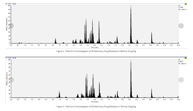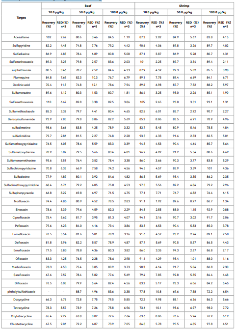 Through low, medium, and high level spiked experiments,the target compounds of 36 veterinary drug residues such astetracyclines, sulfonamides and quinolones in Beef and shrimphave been determined. Biocomma established a UPLC-MS/MSmethod with good recovery and precision for your reference.