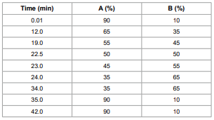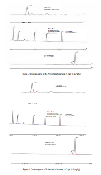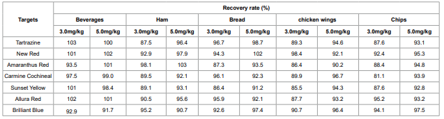 Detector wavelength range: 400~800 nm. (Tartrazine: 415 nm.New red, carmine cochineal, amaranthus red, sunset yellow,allura red and erythrosine: 520 nm. Brilliant blue: 630 nm.)Table 1. Gradient Elution Program