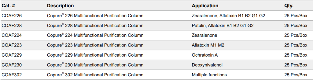 Aflatoxins are toxic and highly carcinogenic metabolites ofAspergillus flavus and Aspergillus parasiticus fungi. When cowsconsume contaminated feed, aflatoxin B1 will be transformedinto aflatoxin M1. A portion of aflatoxin M1 is excreted throughurine and milk, while other portions are stored in meat.Biocomma established a rapid LC method using Copure® 223Multifunctional Purification Plate for detection of aflatoxinsM1 and M2 in milk with good recovery and stability for yourreference. The recoveries were 90-110% with RSD less than5% at both 5 ng/g and 10 ng/g concentrations.