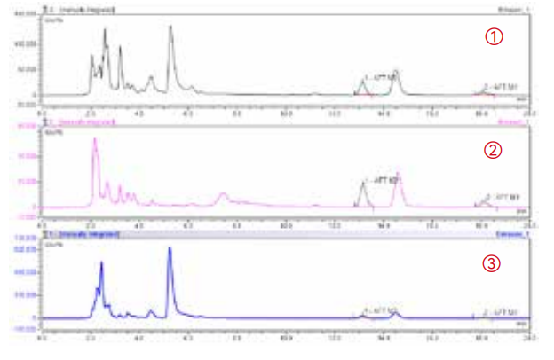 Based on Figure 1, the miscellaneous peaks of sample ② arefewer than sample ① . Less interference of impurities indicatesbetter purification effects. The recovery rates of AflatoxinM1 and M2 are both between 90-110%, and the RSD valueis less than 5%, which meet the standard of experimentalrequirements.