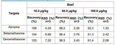 Biocomma established a UPLC-MS/MS method for detectionof dexamethasone, betamethasone and atropine in Beef withgood recovery and precision for your reference. The recoverieswere 85-110% with RSD less than 10% at low, medium, andhigh spiked concentration levels
