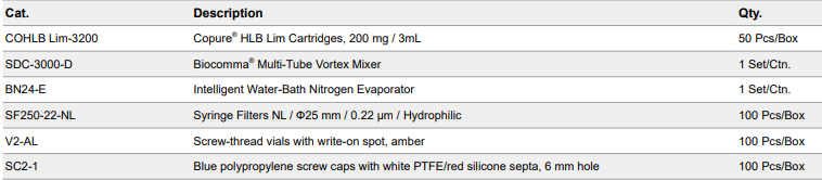 Pipette 1.5 ml supernatant of extracted sample to a Copure®HLB Lim Cartridge. Collect the filtrate and evaporate todryness. Redissolve to 1 mL by 0.1% formic acid in watermethanol (9:1). After filter by nylon membrane, the sample isready for analysis.