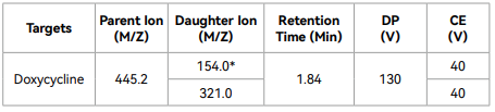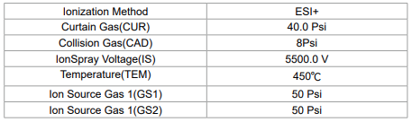 Detection method: multiple reaction ion monitoring (MRM)Table 1. Ion Source Control Conditions