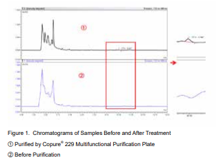 Based on Figure 1, the impurities are obviously absorbed byCopure® 229 Multifunctional Purification Plate. There are nointerference peaks next to the target peak, so the quantificationis more accurate. Based on Table 2, the recovery rates ofOchratoxin A in the 24 wells are all between 90-110%, and theCV value of the recovery rate between wells is less than 5%,which meet the standard of the experimental requirements.