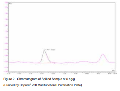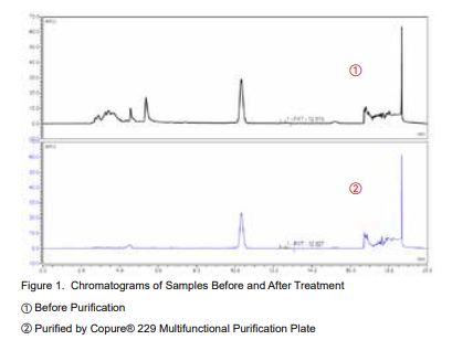 Based on Figure 1, less miscellaneous peaks showingthe impurities are obviously absorbed by Copure® 229Multifunctional Purification Plate. There are no interferencepeaks next to the target peak, so the quantification is moreaccurate.
