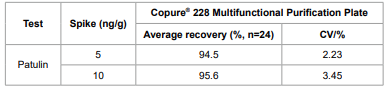Biocomma established a high-throughput LC method usingCopure® 228 Multifunctional Purification Plate for detectionof patulin in apple cider with good recovery and stability foryour reference. The recoveries were 90-110%, and CV valuebetween wells was less than 5% at both 5 ng/g and 10 ng/g concentrations. This method is also applicable to fruit andvegetable juices and alcoholic foods.