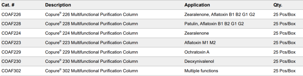 Zearalenone, a non-steroidal mycotoxin from Fusarium fungus,is commonly found in contaminated grains (wheat, corn, oats,barley, etc.). It’s a major global crop contaminant, leadingto adverse effects such as tumors, estrogen presence, andimmune suppression in livestock and poultry that consumecontaminated feed, and then poses a risk to human health.Biocomma established an LC method to detect zearalenonein corn flour using Copure® 224 Multifunctional PurificationColumn. At 8 ng/g and 16 ng/g concentratios, recoveries were90-100% with RSD below 10%. This rapid method outperformscompetitors, ensuring high recovery, efficient decolorization,and impurity removal. It’s a valuable reference for zearalenonedetection in corn flour, applicable to grains, wine, soy sauce,vinegar, soybean, rapeseed, and edible vegetable oil.