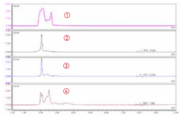 Based on Figure 2, the interference of impurities in sample② are obviously absorbed, therefore miscellaneous peaksare fewer in the TIC chromatogram. The purification effect ofCopure® 224 Multifunctional Purification Column is similar toBrand A and better than Brand B.